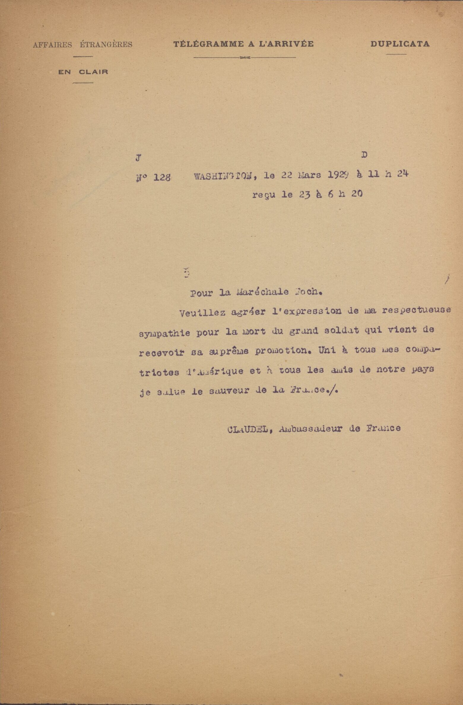 Les réactions à l’international sont nombreuses. Parmi eux, Paul Claudel (1868-1955), frère de la sculptrice Camille Claudel, et grand auteur français, écrit à la maréchale (née Julie Bienvenüe) pour lui transmettre ses condoléances en tant que diplomate à l’Ambassade américaine.